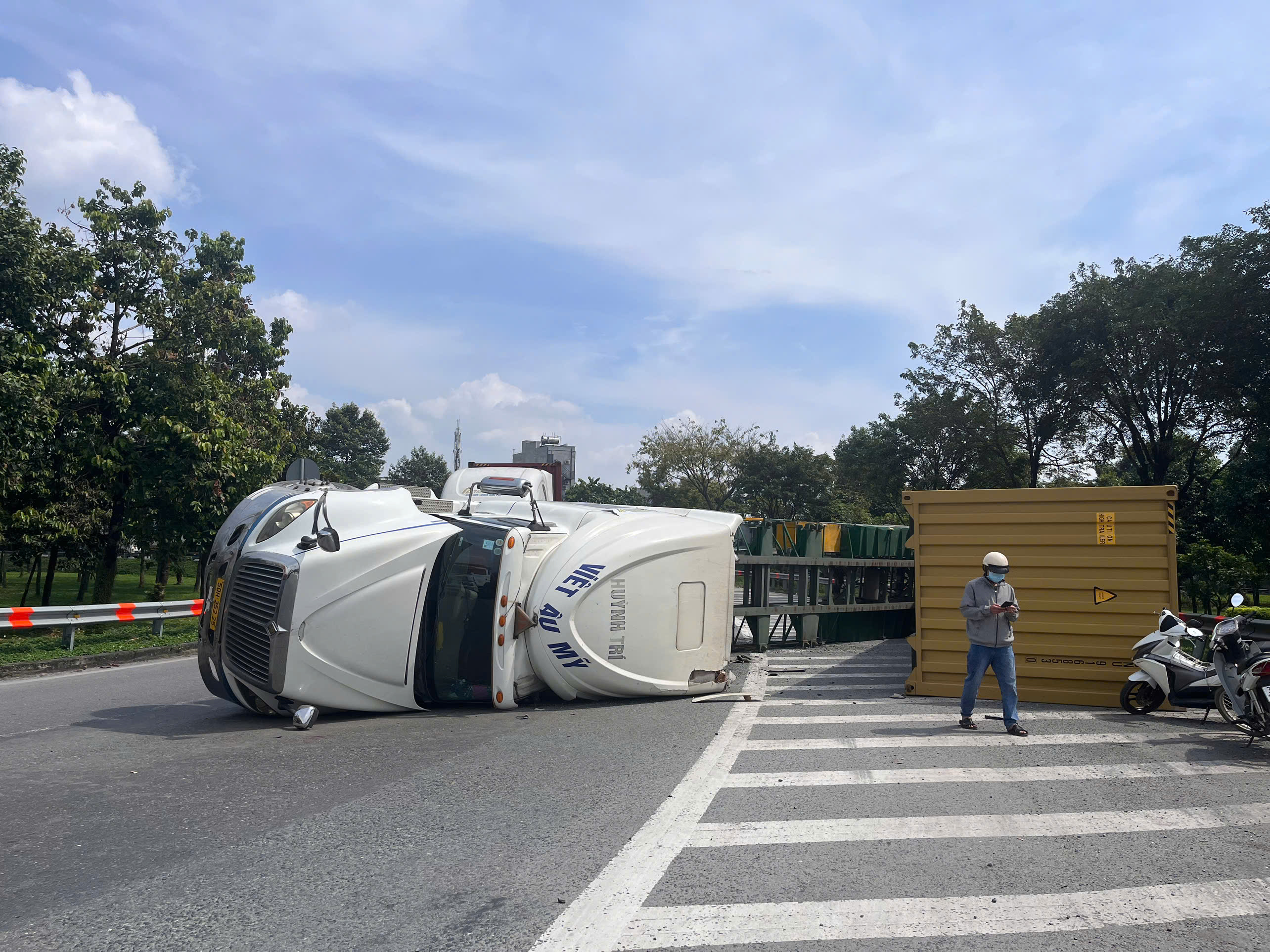 Xe container lưu thông trên xa lộ Hà Nội hướng từ ngã tư Thủ Đức đi Suối Tiên bất ngờ bị lật khi ôm cua lên cầu vượt trạm 2 (phường Tăng Nhơn Phú). Vụ việc khiến tuyến đường bị ùn tắc kéo dài.